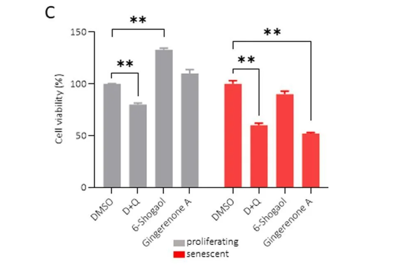 更惊人的是,生姜的“6-姜酚”物质表现力更猛:36小时清除率高达70%。研究负责人解释:“这些成分能促使衰老细胞自我毁灭,腾出空间让年轻细胞发挥最大作用,比传统药物组合达沙替尼+槲皮素(D+Q)高效的多。”